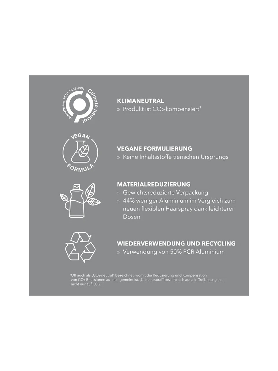 • 44 % weniger Aluminium im Vergleich zu herkömmlichen flexiblen Haarsprays
