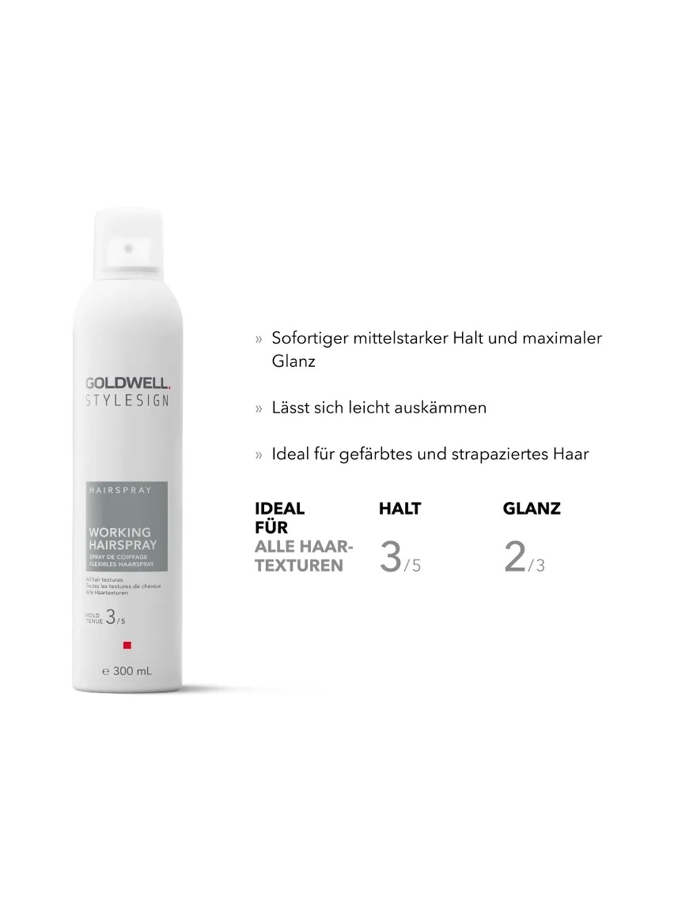 Das Goldwell StyleSign Working Hairspray bietet sofortigen, mittelstarken Halt und verleiht dem Haar maximalen Glanz. Die leichte, flexible Formel sorgt für zuverlässige Kontrolle und ein natürliches Finish – ideal für ein professionelles Styling mit Beweglichkeit und Ausdruckskraft. Das Haarspray lässt sich am Ende des Tages rückstandsfrei auskämmen, ohne das Haar zu beschweren. Dieses flexible Styling-Spray ermöglicht es, Frisuren jederzeit neu zu formen und zu definieren – für ein langanhaltendes, gepflegtes Ergebnis. Dank seiner innovativen Technologie wird das Haar optimal fixiert, bleibt aber geschmeidig und glänzend. Speziell entwickelt für gefärbtes, beanspruchtes oder strapaziertes Haar, vereint dieses Haarspray Styling, Pflege und Schutz in einem Produkt. Die schonende Formel bewahrt die Haarfarbe, schützt vor äußeren Einflüssen und verhindert das Austrocknen der Haarstruktur. Dadurch bleibt das Haar geschmeidig, glänzend und gesund aussehend – auch bei täglicher Anwendung. Egal ob feines, normales oder kräftiges Haar: Dieses Haarspray sorgt für langanhaltenden Halt, strahlenden Glanz und ein gepflegtes Finish.