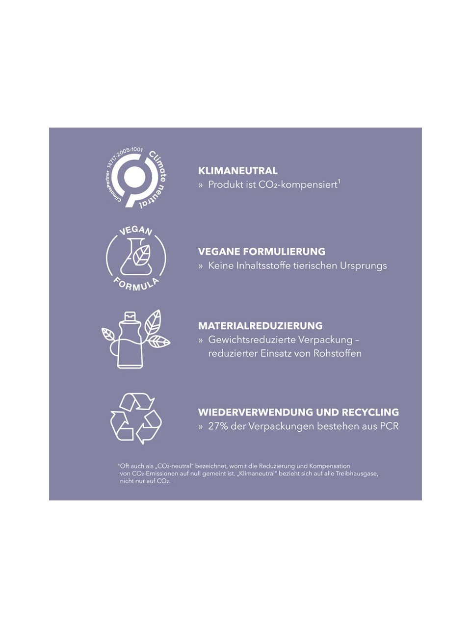 • nachhaltige Inhaltsstoffe: dermatologisch getestet, frei von Inhaltsstoffen tierischen Ursprungs, Sulfaten und Mineralölen