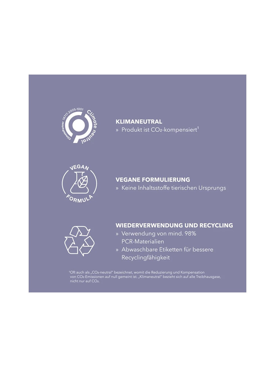 • umweltfreundliche Verpackung: das Produkt besteht zu mindestens 98 % aus post-consumer recyceltem Material (PCR) und verwendet abwaschbare Etiketten zur Verbesserung der Recyclingfähigkeit