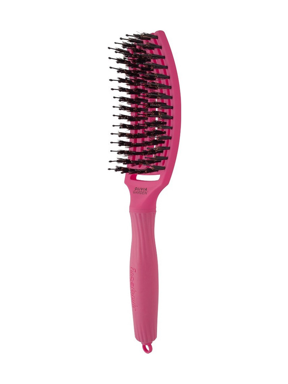 Die Olivia Garden Fingerbrush Combo Medium Hot Pink ist eine innovative Massage- und Entwirrungsbürste mit einer einzigartigen, der menschlichen Hand nachempfundenen Form. Dank dieser Form passt sich die Bürste perfekt der Kopfform an und sorgt für maximalen Komfort bei der Anwendung. Die Kombination aus Nylonborsten mit Noppen und natürlichen Wildschweinborsten ermöglicht eine sanfte Entwirrung von trockenem und nassem Haar – ganz ohne Ziepen oder Haarbruch. Gleichzeitig wird die Kopfhaut stimuliert, was die Durchblutung fördert und für gesünderes, glänzenderes Haar sorgt.