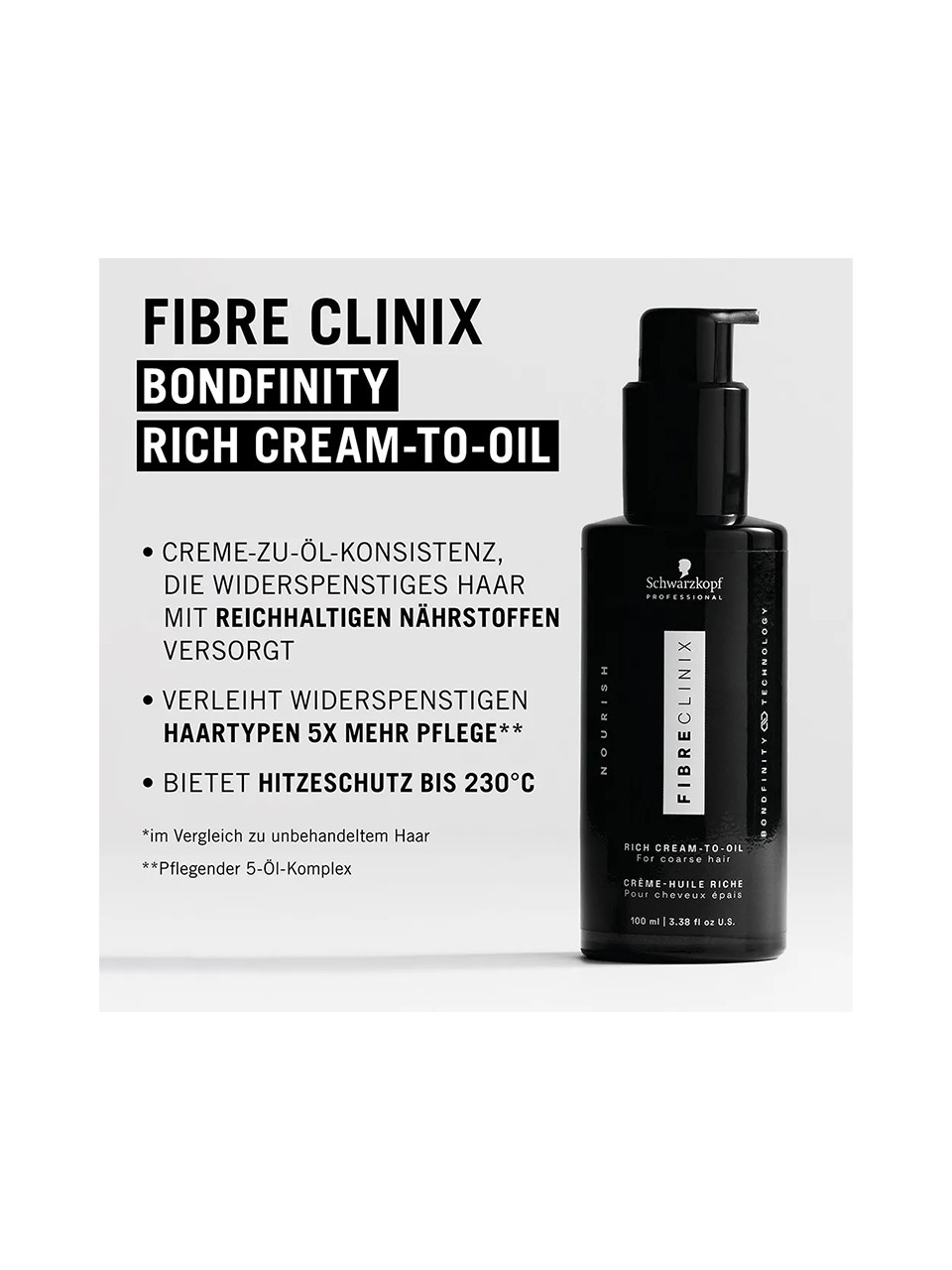 Das Schwarzkopf Fibre Clinix Bondfinity Rich Cream-to-Oil ist ein transformatives und multifunktionales Reparaturöl, das speziell für widerspenstiges Haar entwickelt wurde. Mit der BONDFINITY Technologie und einem 5-Öl-Komplex sorgt es für Geschmeidigkeit, Glanz und intensive Pflege, indem es das haareigene Keratin schützt und die innere Haarfaser mit leichter Feuchtigkeit versorgt. Es hilft, Haarschäden zu reparieren und langfristig zu verhindern, während es Frizz reduziert und einen Hitzeschutz von bis zu 230 °C bietet.