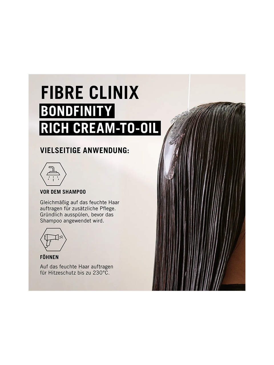 – Föhnen: Auf das feuchte Haar auftragen für einen Hitzeschutz von bis zu 230 °C und verbesserte Kämmbarkeit.