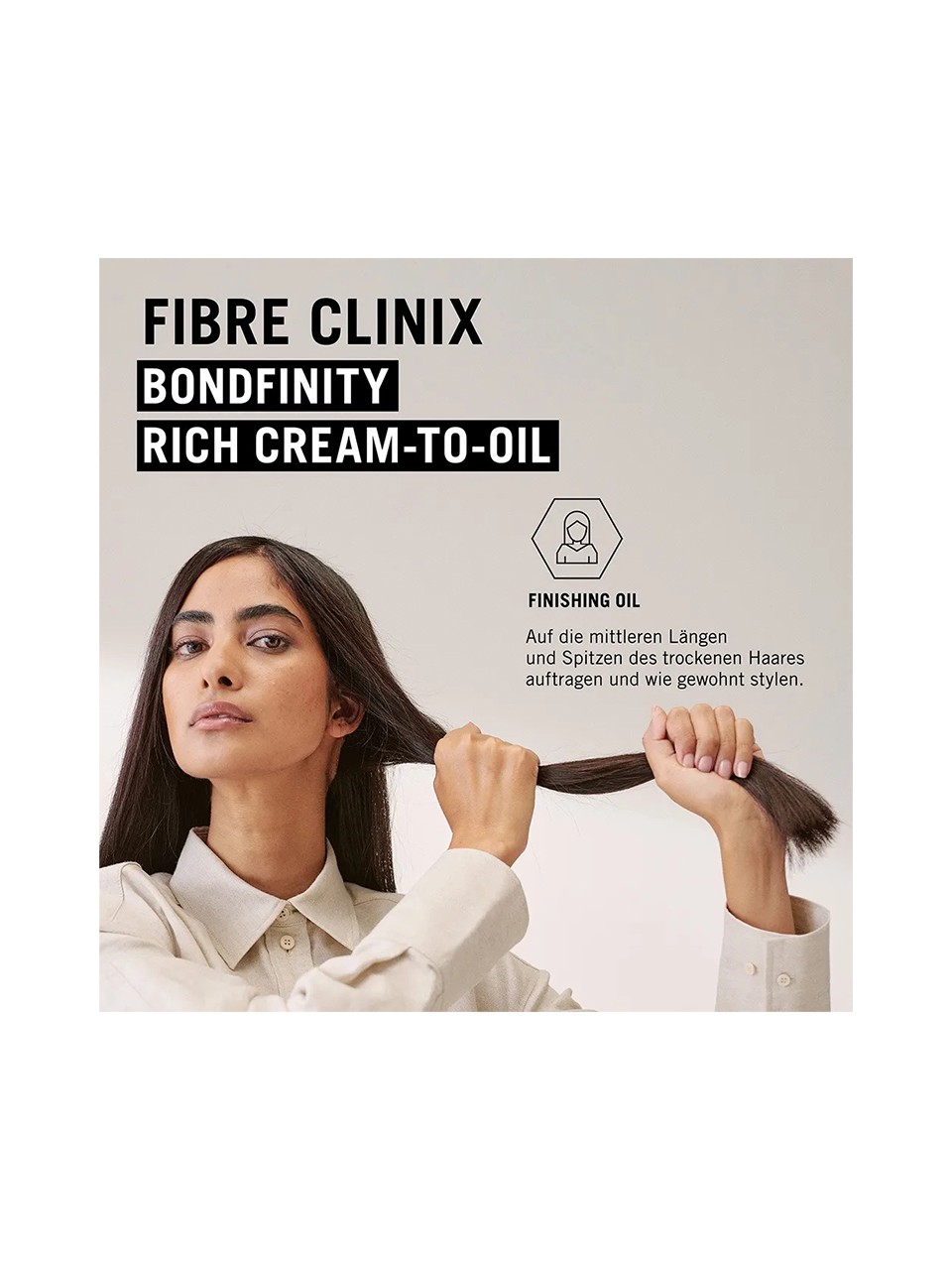 – Finishing Öl: Auf die Längen und Spitzen des trockenen Haares auftragen und wie gewohnt stylen.