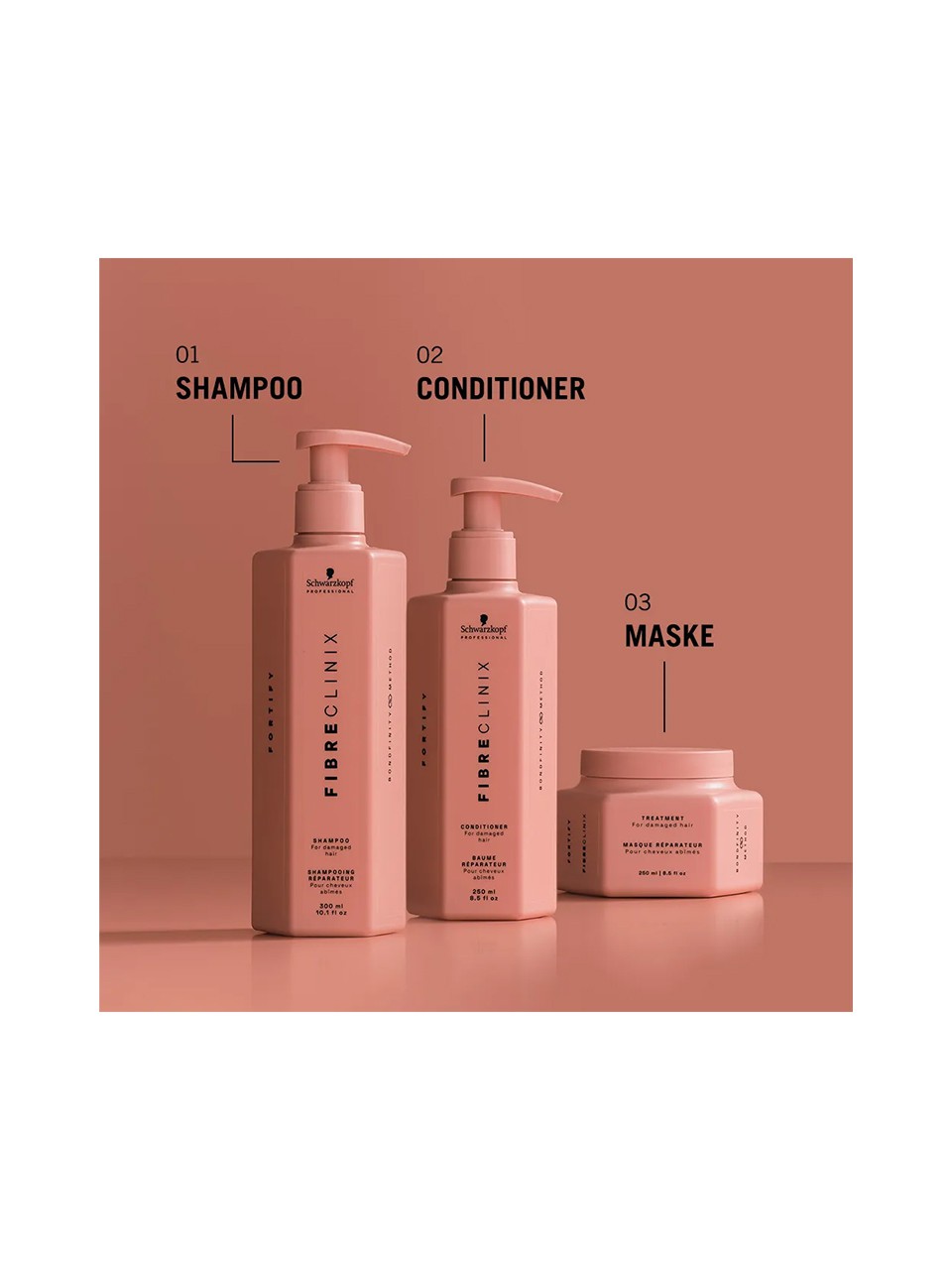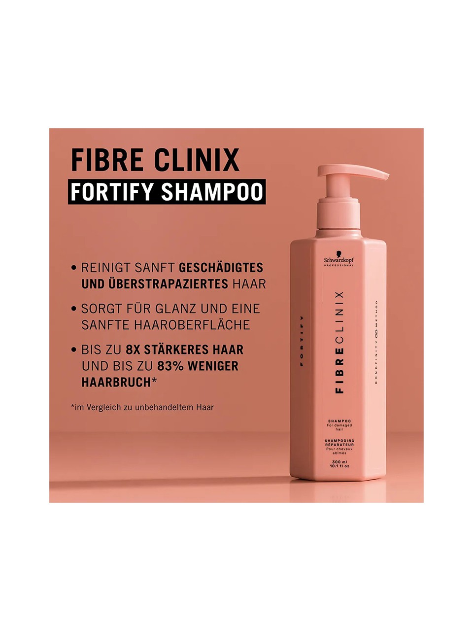 Das Schwarzkopf Fibre Clinix Fortify Shampoo wurde mit der BONDXTEND Technologie formuliert, um das Haar zu stärken, indem innere Faserverbindungen geschaffen werden. Es ist ein reparierendes Shampoo, das geschädigtes und überstrapaziertes Haar sanft reinigt und sofort stärkt, um es auf die Fibre Clinix Heimpflege vorzubereiten. Die Formel mit Multi-Peptiden baut die Haarfaser wieder auf und regeneriert sie, verleiht ihr Glanz und schafft eine glatte Haaroberfläche.