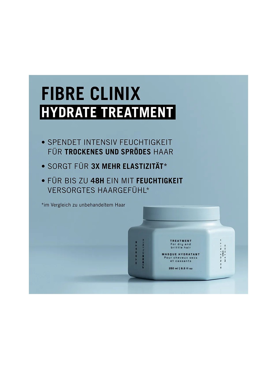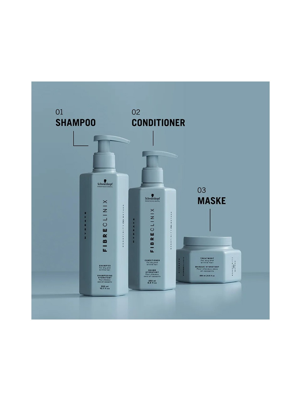 Das Schwarzkopf Fibre Clinix Hydrate Treatment wurde mit der BONDXTEND Technologie formuliert, um das Haar zu stärken, indem innere Faserverbindungen geschaffen werden. Das Treatment versorgt trockenes und sprödes Haar mit intensiver Feuchtigkeit und verleiht ihm tiefgreifende Stärke. Die mit Elektrolyten angereicherte Formel versorgt trockenes Haar mit Tiefenpflege für verbesserte Frisierbarkeit und Elastizität und verleiht ihm Geschmeidigkeit und Glanz.