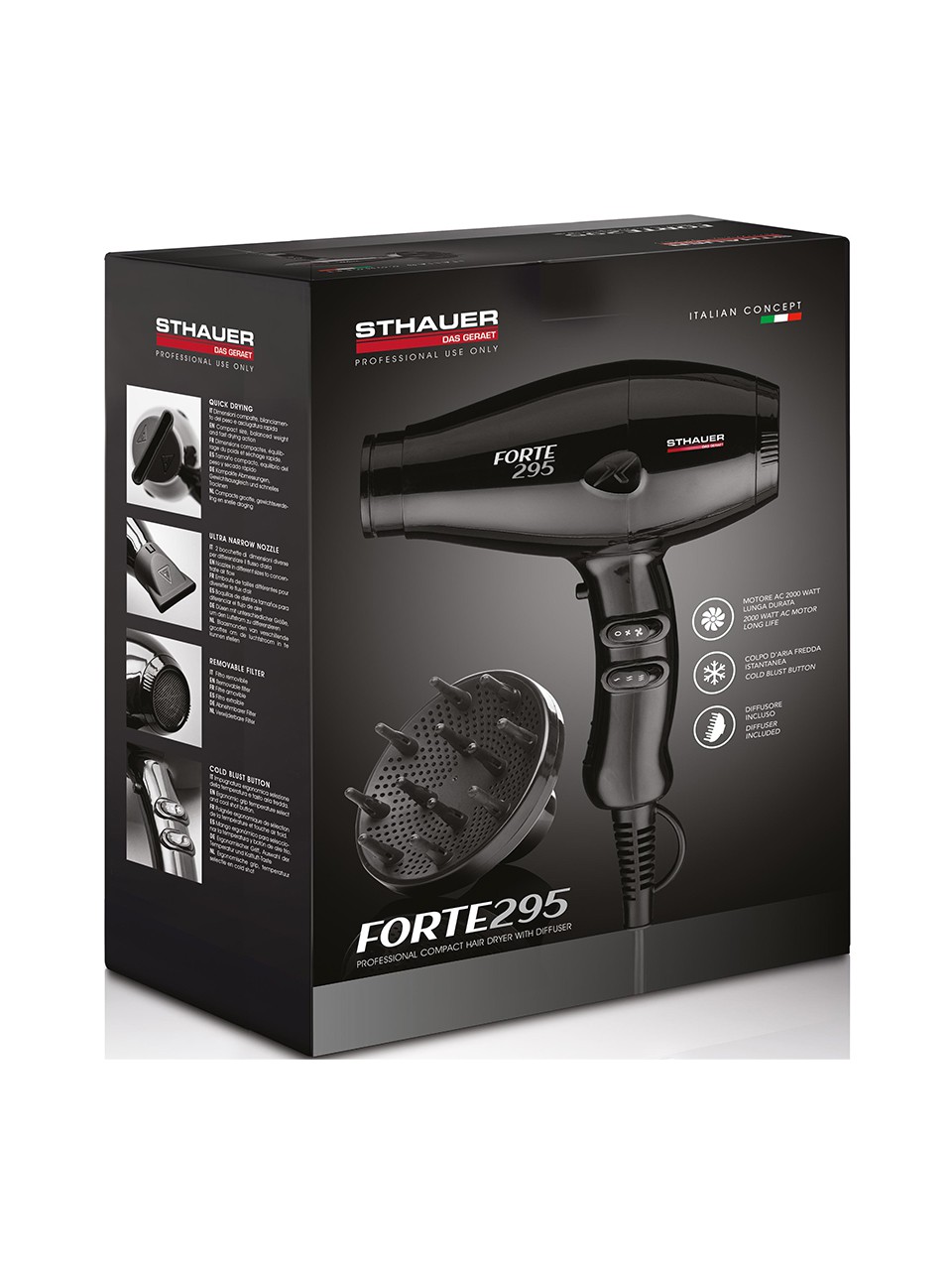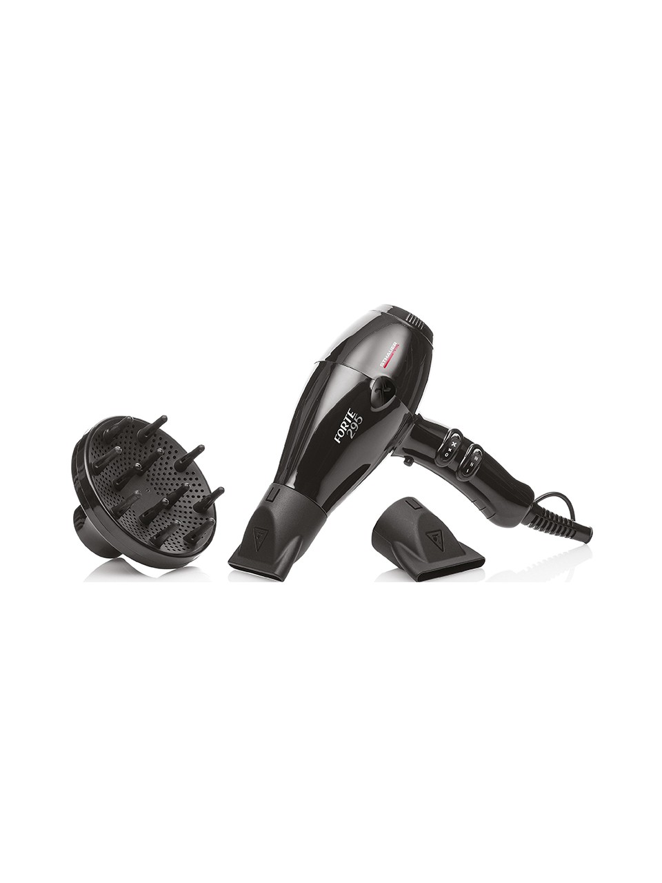 Der Sthauer Forte 295 ist ein kompakter und leistungsstarker Haartrockner mit Diffusor, mit dem sich lockiges Haar mit natürlichem Effekt trocknen lässt. Das Set ist ideal, um mit den 2 Düsen mit unterschiedlicher Größe sowohl perfekte Locken als auch tadellose Wellen zu kreieren.