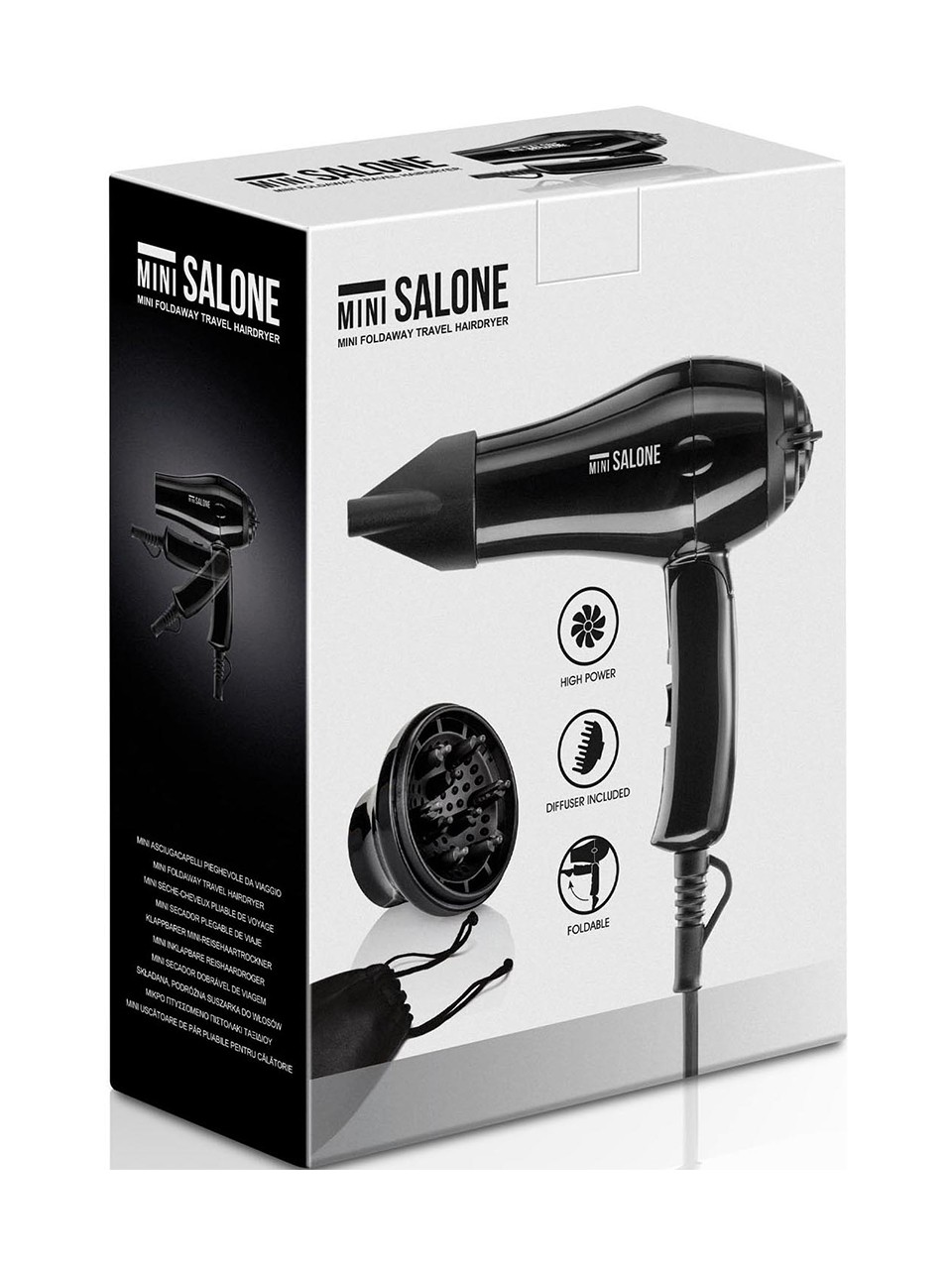 Der Mini Salone ist die perfekte Wahl für unterwegs. Der klappbare Griff reduziert das Volumen auf ein Minimum, was ideal für den Transport ist. 2 Geschwindigkeitsstufen sowie der im Lieferumfang enthaltene Mini-Diffusor und die Düse garantieren Vielseitigkeit und Professionalität in der Anwendung und machen den Haartrockner für alle Haartypen einsetzbar.