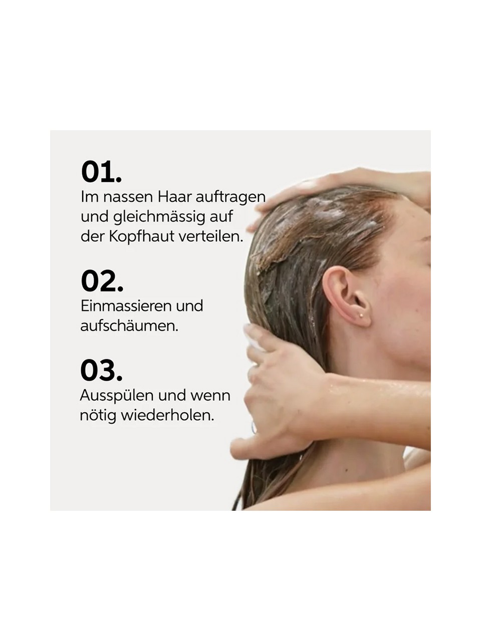 Ins feuchte Haar geben und aufschäumen. Anschließend gründlich ausspülen.