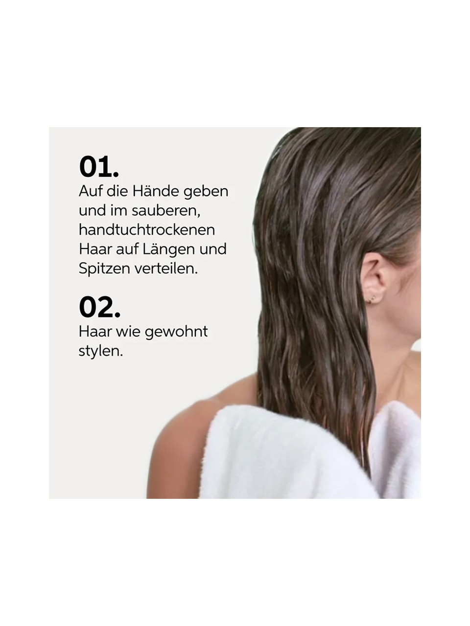 Auf Längen und Spitzen des feuchten Haares geben. Nicht ausspülen und wie gewohnt stylen.