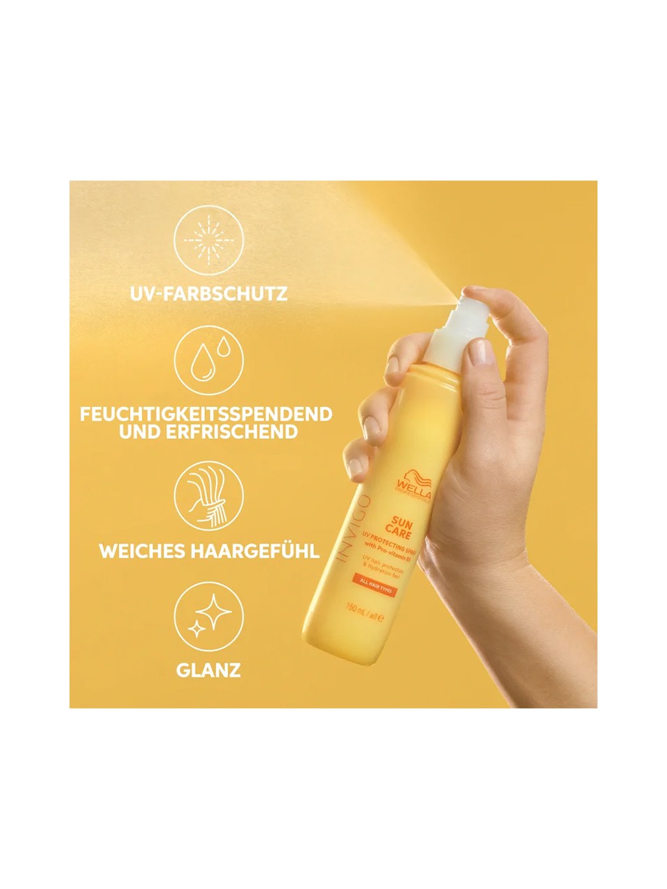 Das Wella Invigo Sun Care UV Protecting Spray ist ein unverzichtbares Sonnenschutzspray für die Haare. Als Teil der Sun Care Serie bietet dieses Spray optimalen UV-Farbschutz und Reparatur für alle Haartypen. Angereichert mit Provitamin B5 und Vitamin E, schützt es die Haarfarbe vor schädlichen UV Strahlen und verleiht dem Haar ein weiches Finish. Mit seiner fruchtigen, blumigen Note ist es der perfekte Sommerduft.